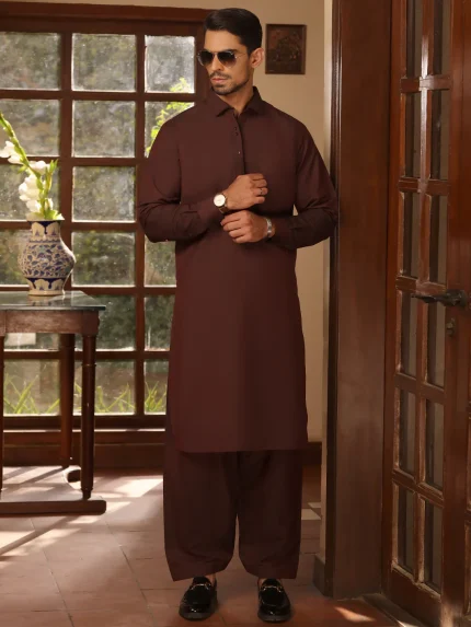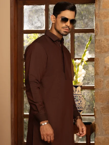 Mid dark brown pure cotton sherwani collar shalwar Kameez