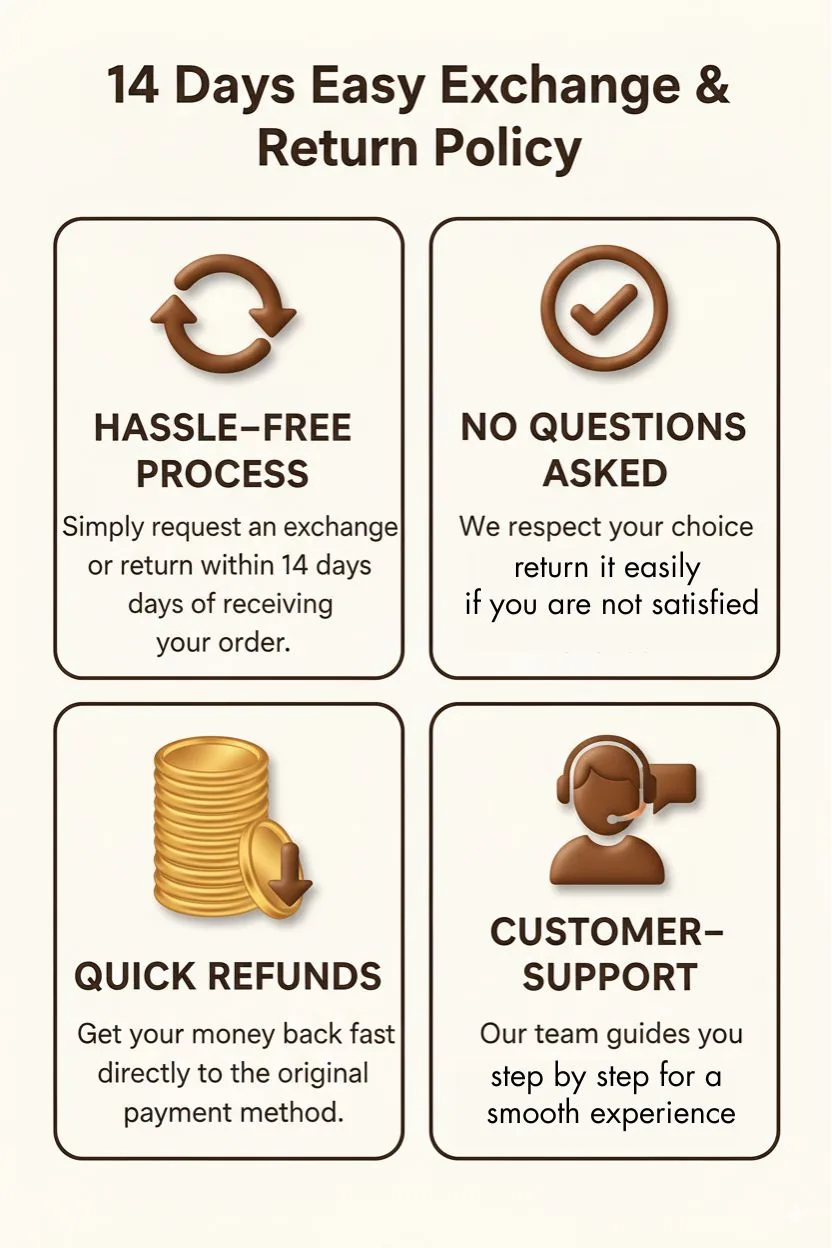 Eligibility: Return or exchange within 15 days for wrong, defective, or incorrect-size items.