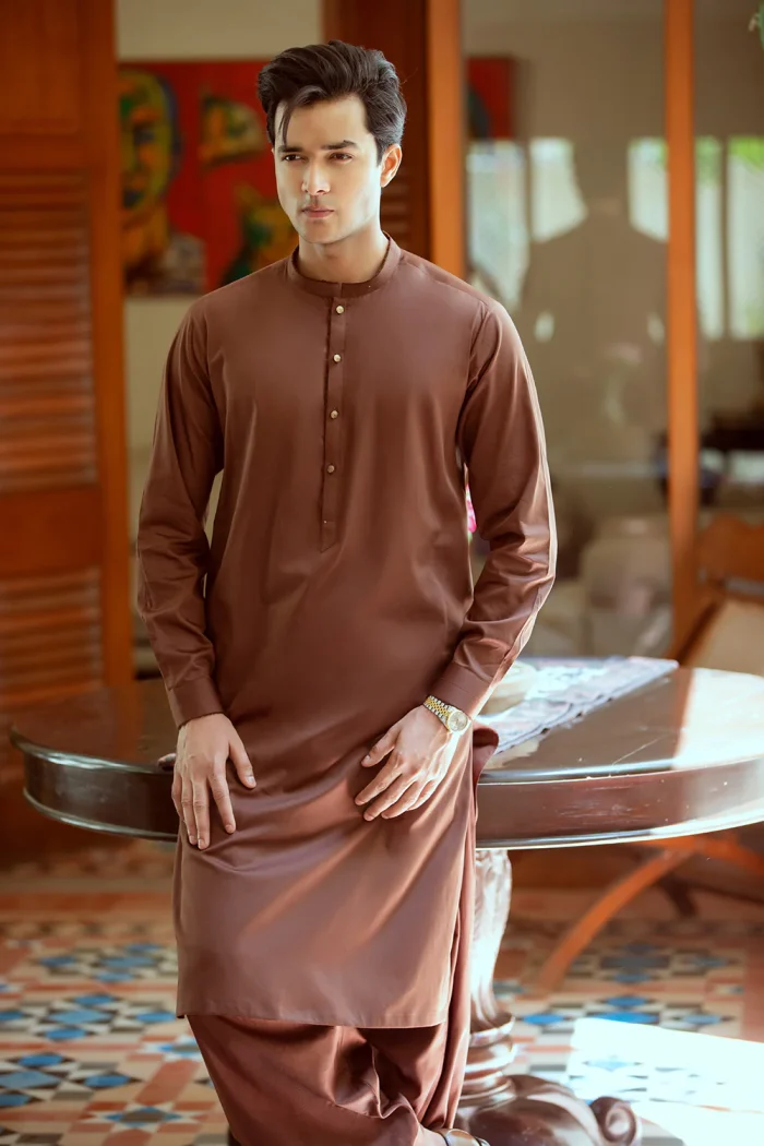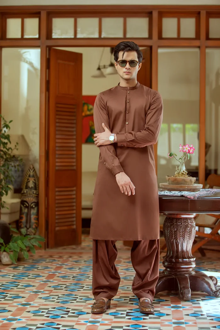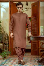 Mid dark brown pure cotton sherwani collar shalwar Kameez